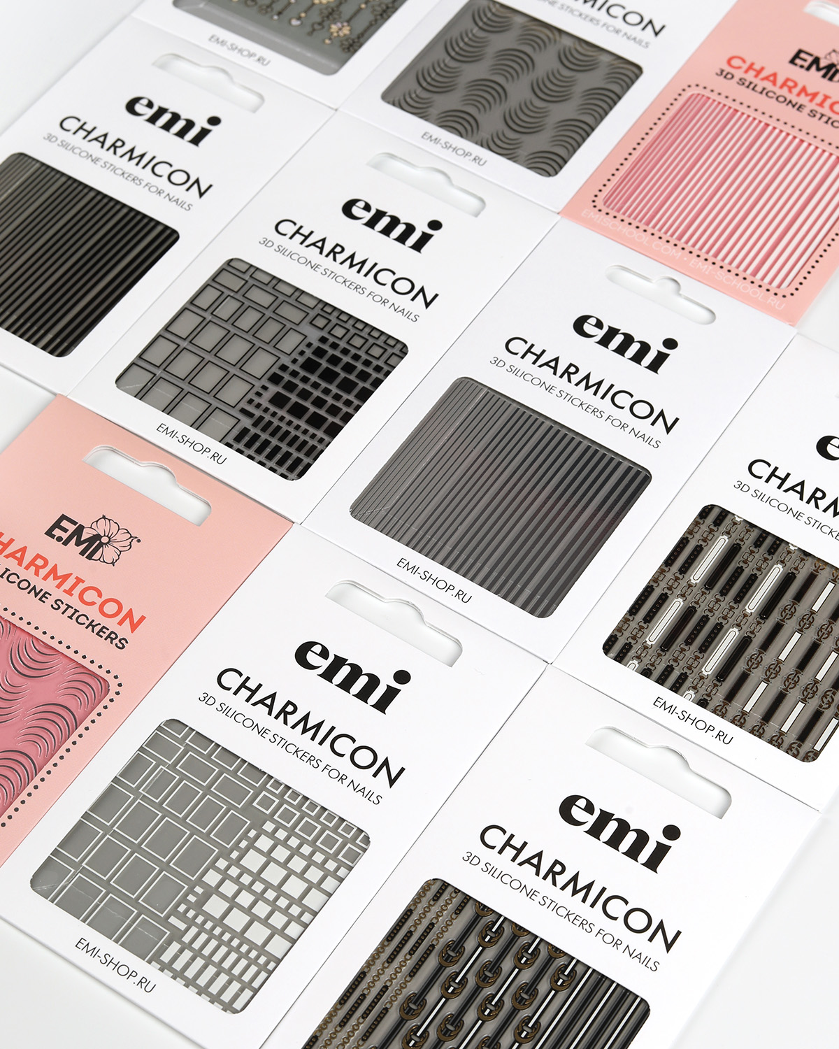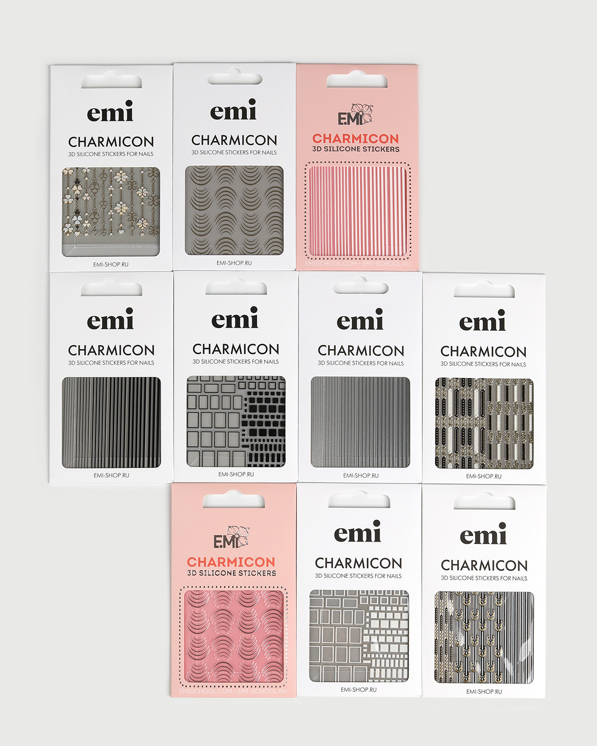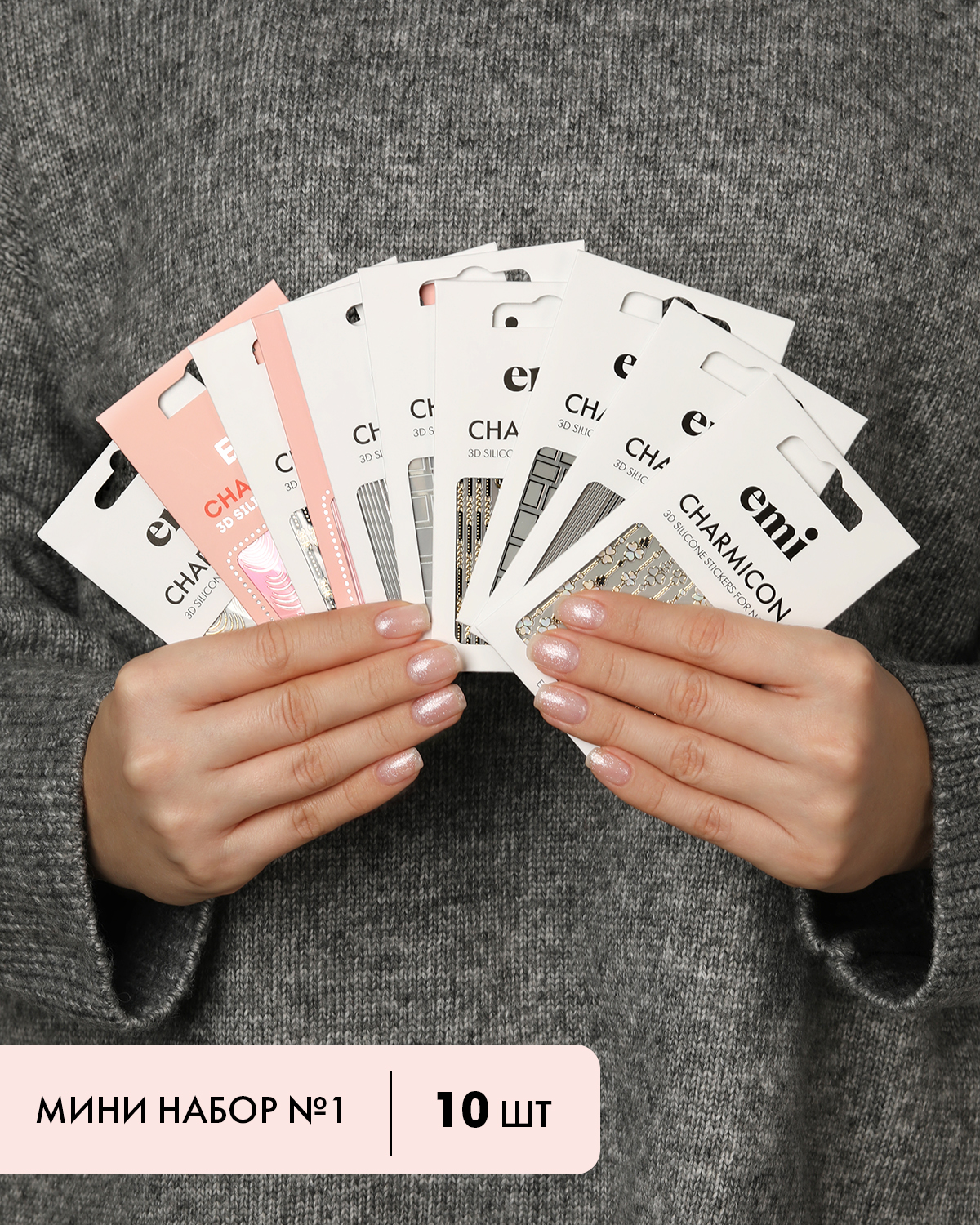 Мини-набор №1 от бренда E.Mi – это 10 слайдеров с объемными цветными наклейками для быстрых дизайнов на ногтях.